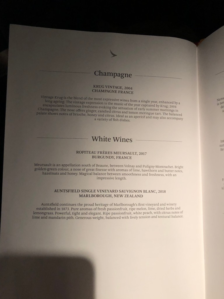 キャセイのファーストの泡は、時々変わりまして、今回は安定のKrugでした。毎回Krugが提供されるわけではありません。